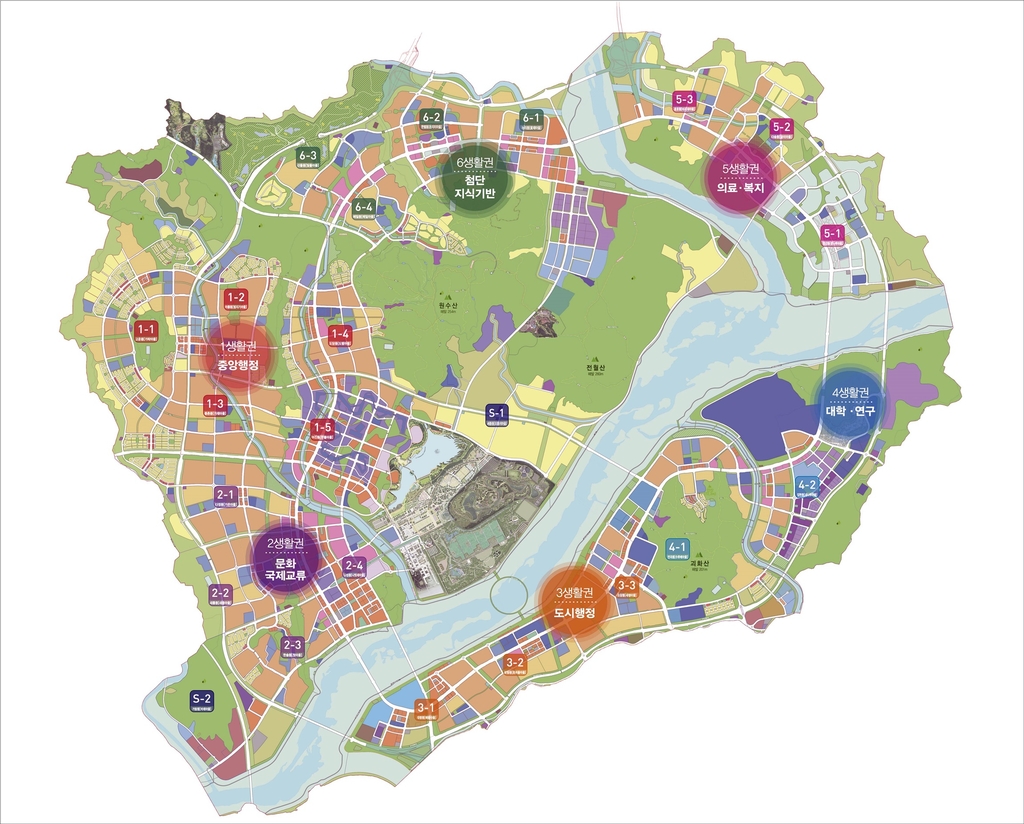 아래 이미지는 세종시의 주요 생활권을 보여주는 지도입니다. 각 투자 유망지는 다음과 같은 위치에 있습니다: